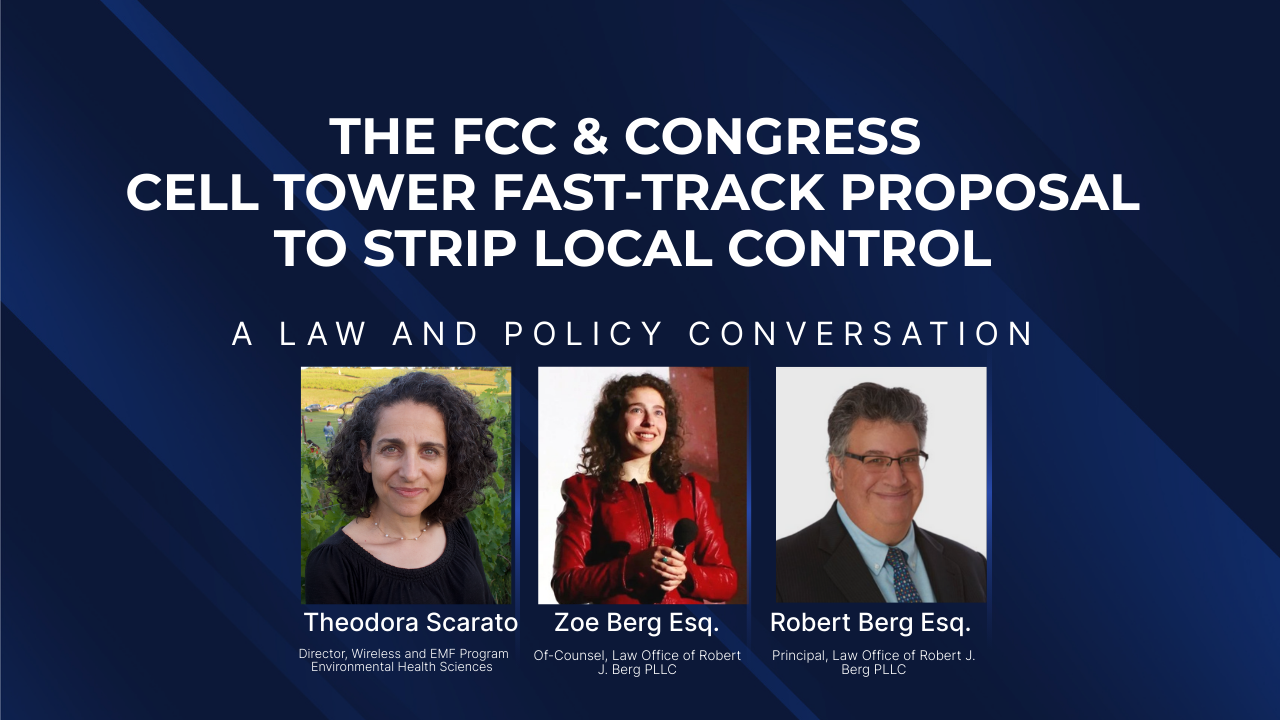 Robert and Zoe are telecommunications lawyers and staunch advocates for pubic health and preserving state and local authority over the siting of wireless telecommunications infrastructure. More at Robertjberglaw.com