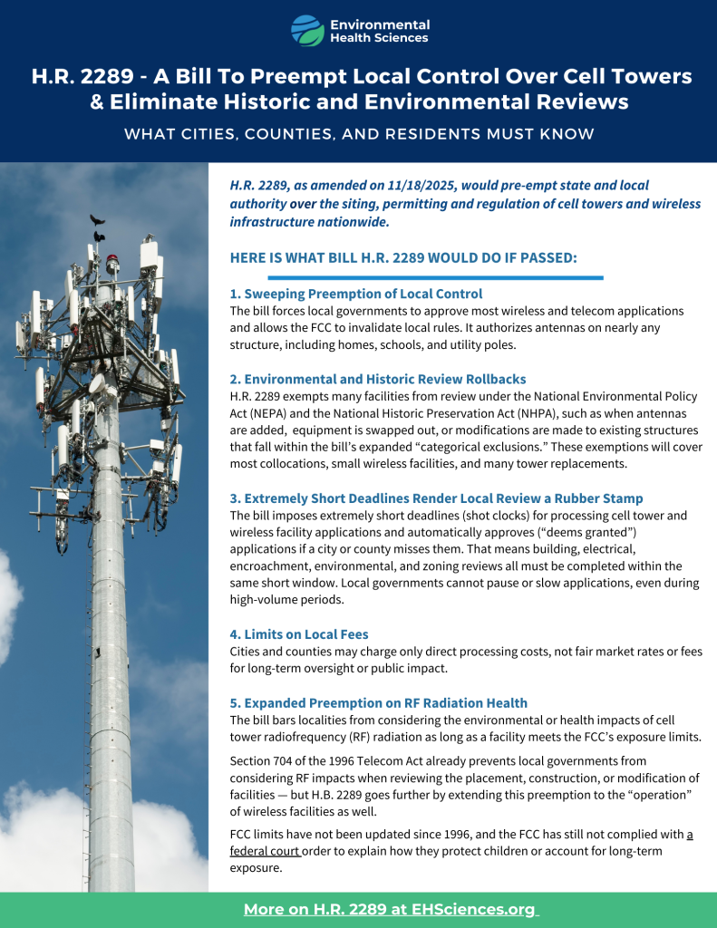The FCC has released a sweeping new proposed rulemaking – WT Docket No. 25-276 – which is intended to strip local control over the siting of powerful, ugly, industrial wireless telecommunications equipment. At the same time, Congress is considering H.R. 2289, a bill that would similarly strip local control and exempt numerous wireless telecommunications facilities from environmental and historic preservation reviews. This deregulatory effort comes despite the FCC’s failure to comply with the D.C. Circuit’s 2021 EHT v. FCC court order and an ever-growing body of peer-reviewed scientific evidence linking wireless radiation exposure to serious adverse health impacts.