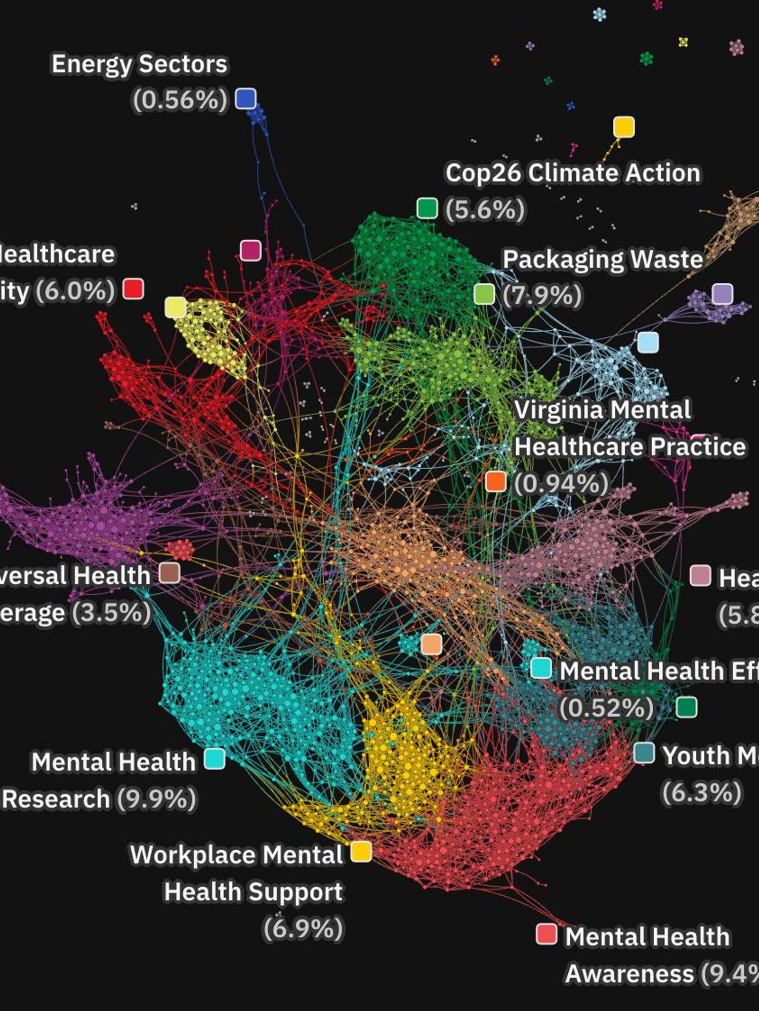 But they’re not islands: Many of the mental health clusters spider into and connect with healthcare clusters.