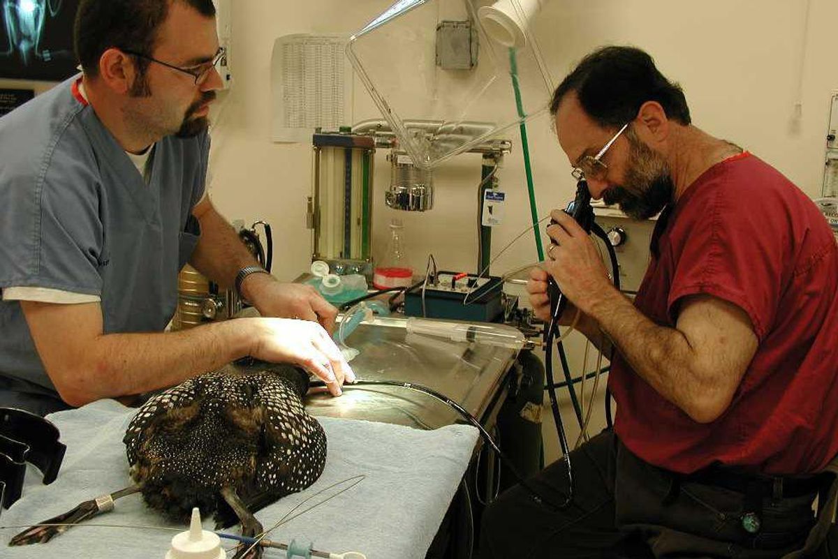 Banner photo: Wildlife veterinarian Mark Pokras (R) performs an endoscopy on an anesthetized common loon in an attempt to remove ingested lead fishing gear. (Credit: Tufts Wildlife Clinic)