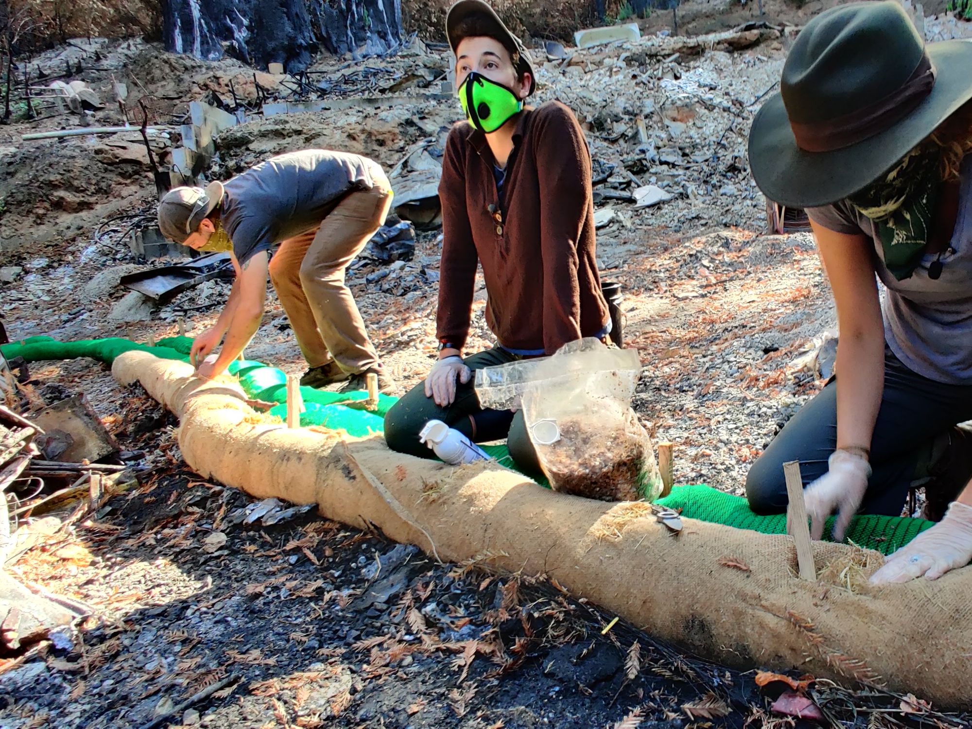 After a fire, filter socks — a straw-filled cylindrical tube designed to trap particles and debris as water flows through — can be placed around a burned area to prevent erosion and trap pollutants, preventing burned structures from leaching toxics into nearby waterways. Elson is introducing a local variety of oyster mushroom to these filter socks. While the tubes prevent erosion, the idea is that the fungi will degrade any toxic substances that come through. Though too early to draw conclusions, Elson told EHN early findings suggest improvement in the way soil particles bind together, potentially leading to less erosion.