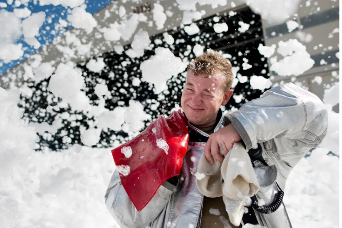 Photos released by the Defense Visual Information Distribution Service in 2013 show personnel working in the foam without protective gear. The description calls the “small sea of fire retardant foam” at Travis Air Force Base in California “non-hazardous” and “similar to soap.”
