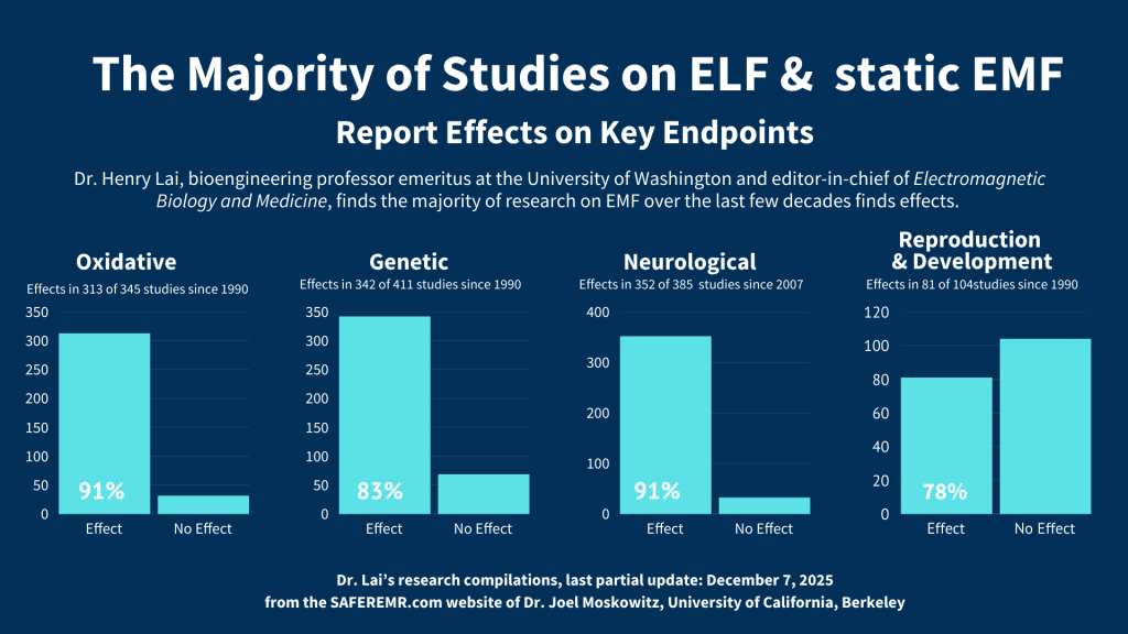 Dr. Henry Lai, Professor Emeritus at the University of Washington, Editor Emeritus of the journal, Electromagnetic Biology and Medicine, and an emeritus member of the International Commission on the Biological Effects of EMF, has compiled summaries of the research on the biological effects of exposure to radio frequency (RFR) and extremely low frequency (ELF) and static electromagnetic fields (EMF). His set of abstracts, which covers the period from 1990 through November 2025 constitutes a comprehensive collection of the peer-reviewed research.