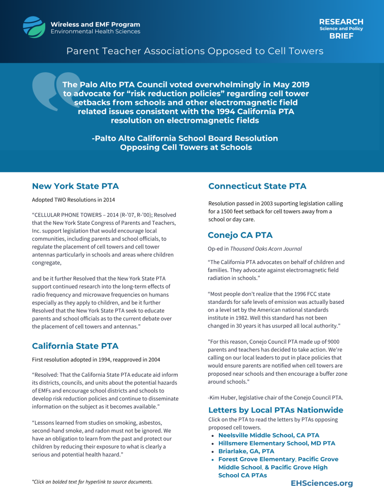 Across the United States, a growing number of Parent Teacher Associations (PTAs) have taken action on a critical children’s environmental health issue: cell towers near schools. From California to Connecticut to New York, state PTAs have issued resolutions to prevent health risks related to electromagnetic field (EMF) exposure. Numerous local PTAs have also used their voice to influence decisions about cell towers and school safety.