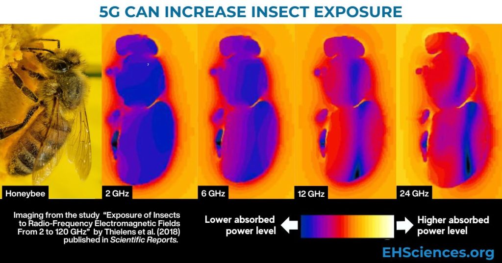 Even when cell antenna power levels remain the same, shifting to higher frequencies dramatically increases the amount of radiation absorbed by insects—particularly in the brain and other vital organs.