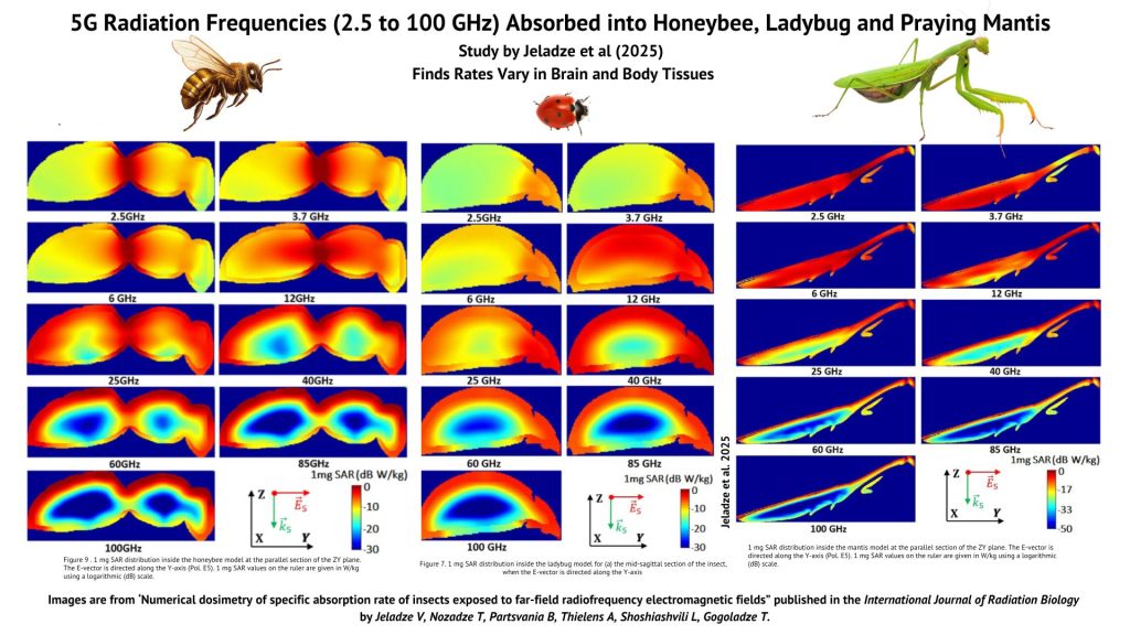 More recent studies have found significant increases in energy absorption in bee brains and vital organs at specific high frequencies used in modern technologies. A 2025 study published in the International Journal of Radiation Biology examined how 5G and next-generation wireless radiofrequency (RF) radiation frequencies are absorbed into 4 different insects – the honeybee, wasp, ladybug, and praying mantis, and found sharp increases depending on several variables, including the waves’ frequency and polarization, and the insect’s size, structure, and morphology.